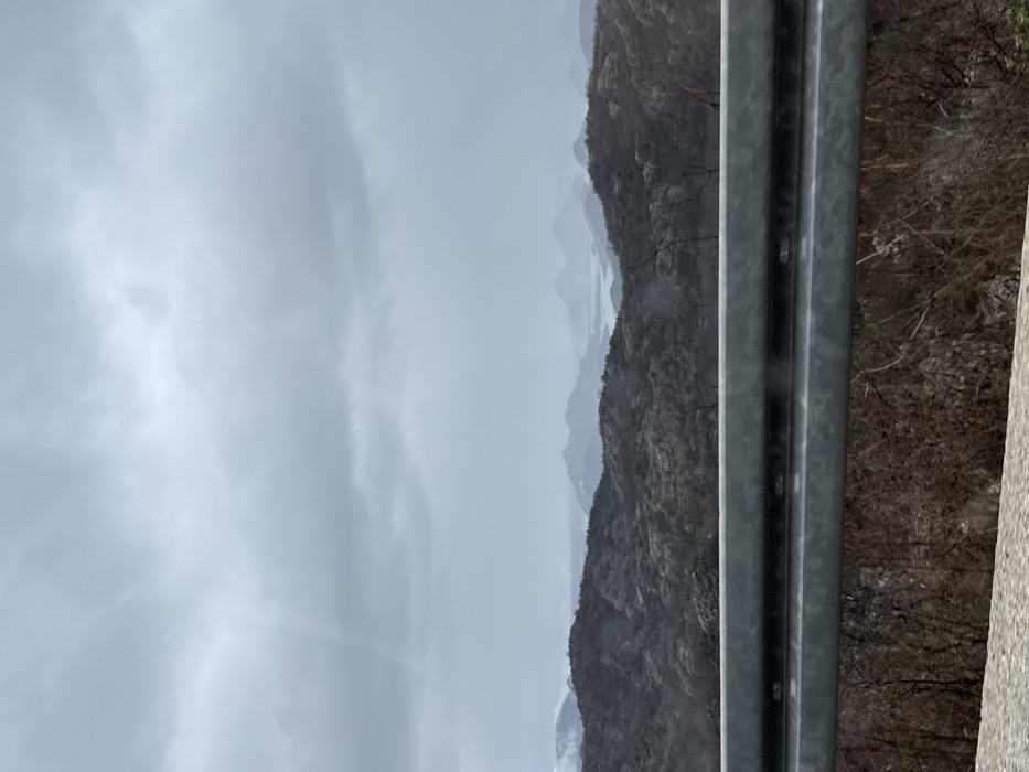 The image displays a panoramic landscape observed from an elevated roadside vantage point in Gornja Brova, Montenegro. A grey metal two-bar guardrail occupies the lower third of the frame, positioned horizontally. Below the guardrail, a dense cluster of dark, bare tree branches and rocky terrain is visible. The midground consists of a series of undulating mountains and hills, their surfaces covered in dark, sparse vegetation, possibly leafless trees or scrub, indicating a dormant season. In the background, multiple layers of mountains recede into the distance, progressively lighter in tone due to atmospheric haze. A large body of water, consistent with a lake, is discernible between the distant mountain ranges. The sky is entirely overcast, uniformly grey with heavy cloud cover. There are no individuals, specific actions, or interactions depicted in the scene.