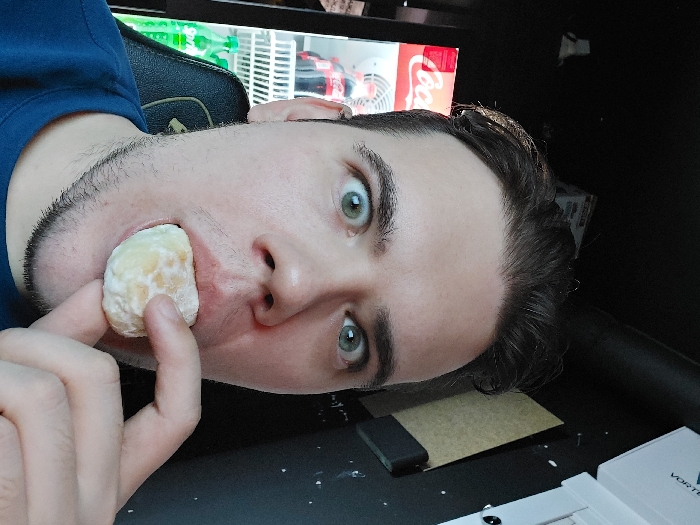 A close-up, mid-shot depicts a male individual indoors in Tashkent, Uzbekistan. The subject has fair skin, dark hair, green eyes, and visible stubble on his chin and jawline. He is wearing a blue crew-neck shirt and displays a wide-eyed, exaggerated expression, looking directly at the camera. He is in the act of eating, holding a light-colored, round pastry with his right hand and partially inserting it into his open mouth. The background on the left reveals a portion of a commercial glass-front refrigerator with a prominent "Coca-Cola" logo visible at the top. Inside, multiple red Coca-Cola bottles are visible on an upper shelf, and green bottles, likely Sprite, are on a lower shelf, separated by a white rack. A black gaming chair's headrest is partially visible behind the subject. The background on the right consists of a dark wall or surface with several white boxes stacked or placed, one bearing the partial label "VORTEX." A piece of light brown material is affixed to this dark surface, and a small black object rests on a surface below the boxes.