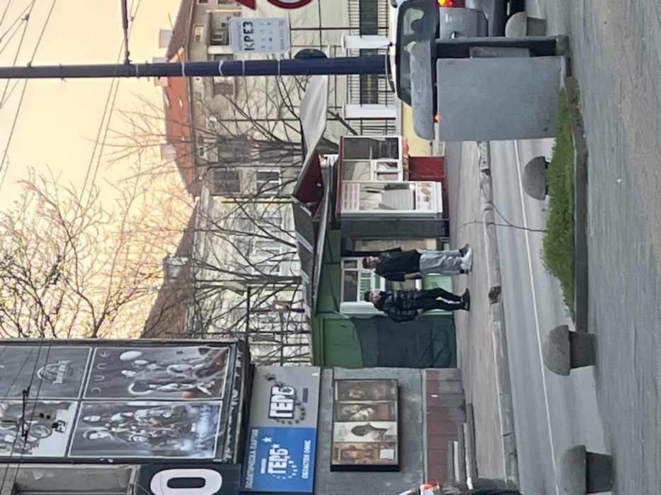 The image depicts an urban street scene in Pazardzhik, Bulgaria, during late afternoon or early evening, characterized by warm, low-angle sunlight. On a concrete pavement, two male individuals stand near a pair of interconnected kiosks. The individual on the left wears a dark puffer jacket, dark trousers, dark shoes, and carries a dark backpack. He is oriented slightly right. The individual on the right wears a dark short-sleeved top, light grey sweatpants, white sneakers, and a dark cap, oriented slightly left. Both individuals are standing still; no direct interaction between them is evident. To their left, a multi-story building facade, dark grey with a visible concrete base, features multiple advertisements. The upper section displays large black and white movie posters, including two for "DUNE," partially obscured by a large "O" shaped sign. Below these are two blue signs for "ПОЛИТИЧЕСКА ПАРТИЯ ГЕРБ" (Political Party GERB), one marked "ОБЛАСТЕН ОФИС" (Regional Office), and an illuminated display case with four additional movie posters. To the right of the individuals are two kiosks. The left kiosk is rectangular, green-painted, with a metal-covered, angled roof and a green tarp on its left side. Attached to its right is a smaller white kiosk with a red base/trim and a service window. In the midground, a tall, dark utility pole supports overhead wires. A white informational sign for "КРЕЗ" and "ТАХИ" (TAXI) with a website (www.krez.bg) is affixed to the pole, above a red circular sign. The background features several multi-story buildings, predominantly light-colored with red-tiled roofs, partially obscured by bare deciduous trees, indicating a late winter or early spring season. The road consists of asphalt, with a small concrete island containing sparse green vegetation and two hemispherical grey concrete bollards. In the foreground, on the right, the rear of a silver/grey vehicle with an illuminated red taillight is visible, alongside a grey utility box. A partial view of a silver/grey vehicle is also present in the far left foreground. The sky exhibits a clear, light orange-yellow hue.