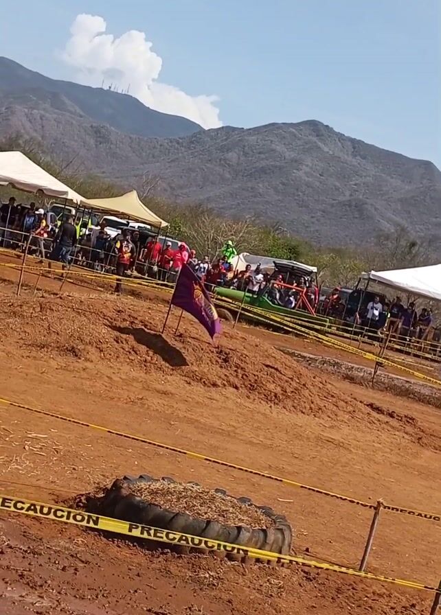 n off-road event in a muddy field with mountains in the background. There are several tents and a crowd of people gathered behind a safety barrier. A purple flag with the words "Ron Barcelo Royal" is planted in the mud. A green jeep is parked behind the crowd. Several people are walking around the muddy field. The video is shot from behind a person wearing a black hat.