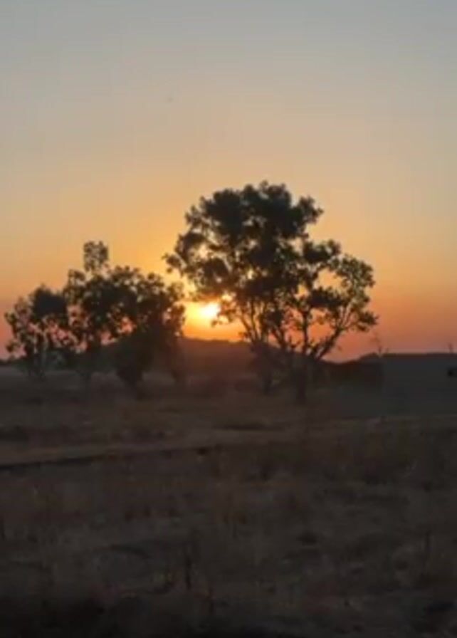 sunset in a rural area. The sun is setting behind two trees, creating a silhouette effect. The sky is a gradient of orange and yellow. The ground is dry and covered with grass. A small building can be seen in the distance.