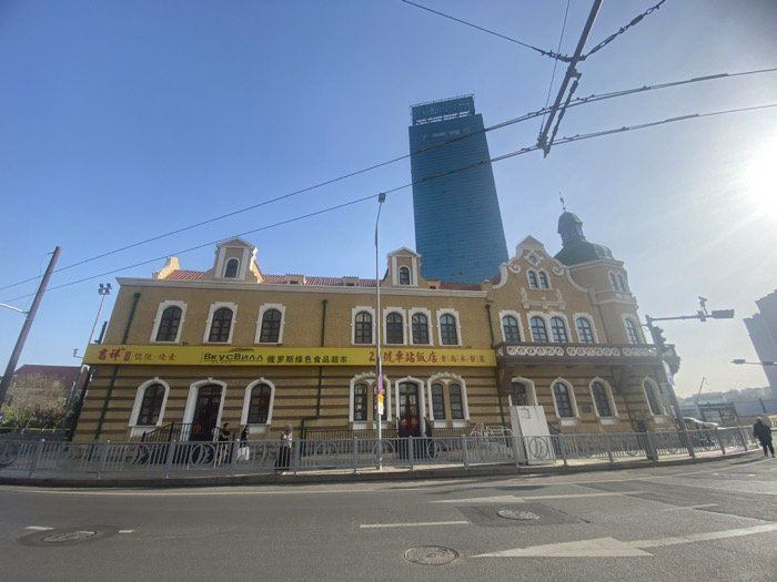 street scene in Qing Dao Shi, China, at the intersection of a street and a crosswalk. The camera is positioned at street level, looking toward the intersection. The weather is sunny and clear. The street is paved and empty except for several pedestrians. A yellow building with arched windows, a large yellow sign, and a metal fence sits on the corner. The building has ornate architectural details, suggesting it's a historic structure. A tall, modern, glass building with a flat roof rises in the background. Power lines run overhead, and streetlights are visible. Several people are walking in the crosswalk toward the left side of the scene. Two people are near the fence, appearing to be talking or interacting. Two cyclists are positioned near the crosswalk. The scene is one of a bustling urban setting with a mix of historic and modern architecture.