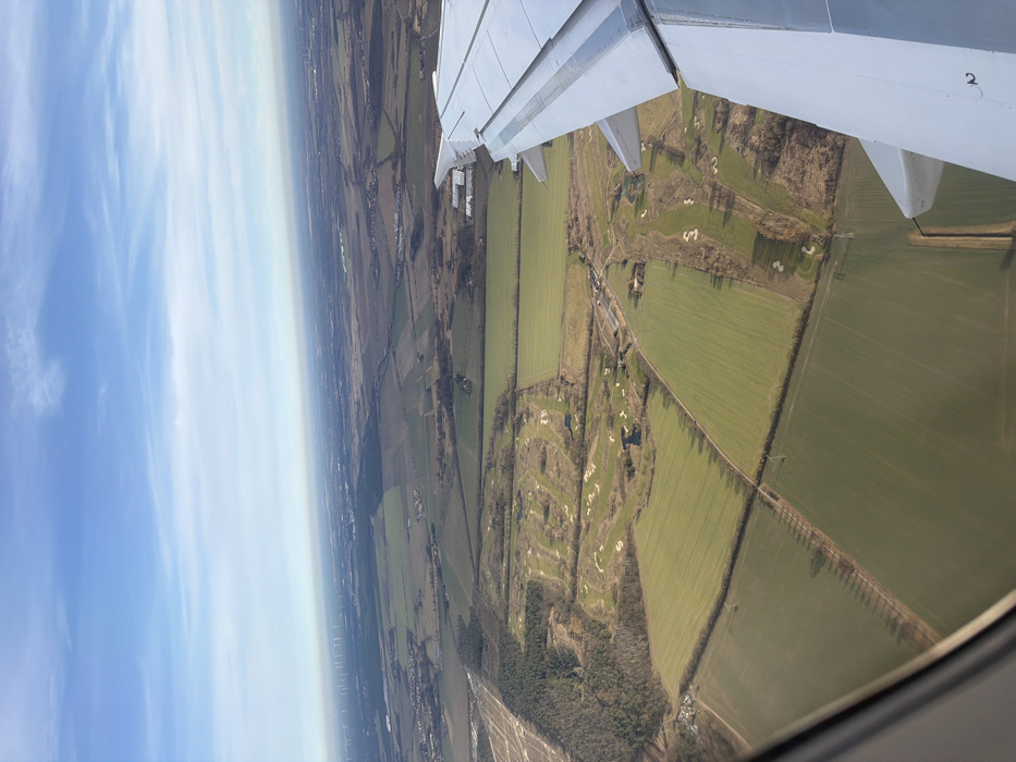 An aerial photograph captures a rural landscape near Schönefeld, Germany, viewed from the window of an airborne aircraft