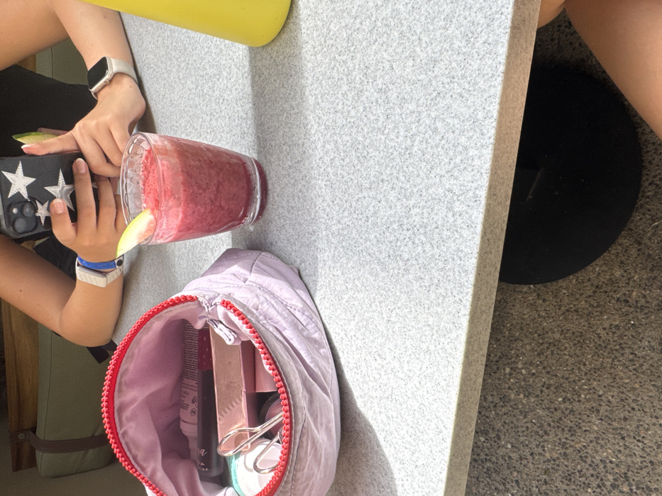 On a speckled gray surface, a woman holds a phone with star embellishments next to a glass of pink smoothie garnished with fruit. A light purple makeup bag with a red zipper reveals makeup items inside. A yellow object is visible in the upper-left corner. The woman is wearing a white smartwatch and a blue bracelet. Part of a black object sits on the right edge, on an outdoor surface.