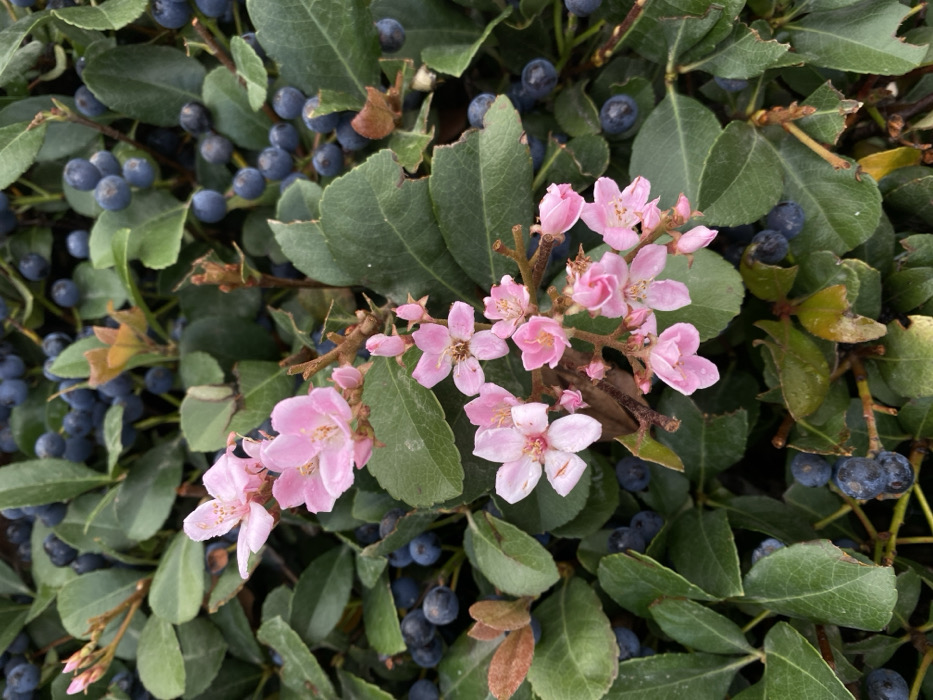 The scene displays a close-up, top-down view of a densely foliated shrub, located in Netanya, Israel. Clusters of small, five-petaled pink flowers, some fully open with visible stamens, and numerous spherical, ripe, dark blue to purplish-black berries are distributed throughout the plant. The foliage consists of dark green, ovate leaves, some exhibiting minor imperfections. Thin, brown, woody stems support the plant material. The environment is outdoor, under natural, diffused lighting.