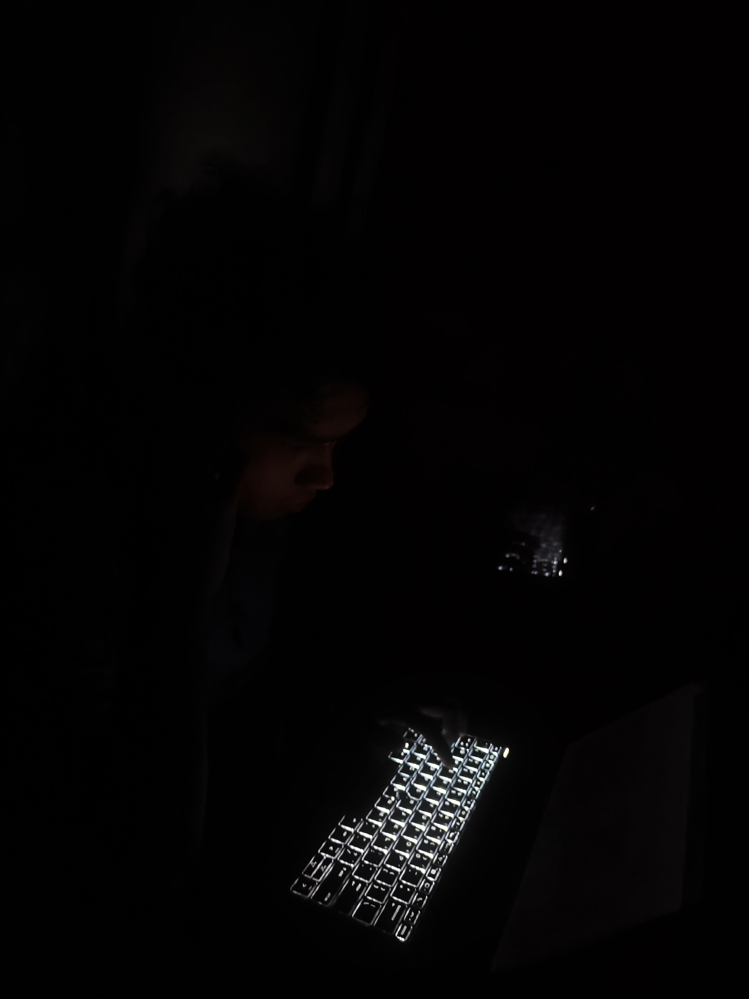 A person is illuminated by the light of a laptop keyboard