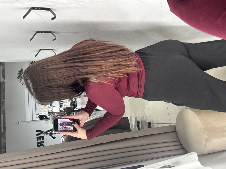 A female individual is depicted from the back, inside a fitting room of the "ЯРВ" clothing store located at Kirov Ave, 21, Apatity, Russia. She has long, straight, dark brown hair with lighter auburn highlights and wears a fitted, long-sleeved burgundy top and black ribbed wide-leg pants. Her left hand holds a dark-colored smartphone horizontally, pointed towards a mirror (not directly visible) to capture her reflection. The phone's screen displays her reflection, showing the burgundy top and black pants. In the background reflection, a retail space is visible with clothing racks displaying various garments, including hats and light-colored tops. A white wall with the reversed text "ЯРВ" (YARV) and a small security camera is also reflected. To the right, four black, hexagonal-shaped coat hooks are mounted on a white wall. A heavy beige curtain partially obscures the left side of the frame, and a beige, circular plush stool is visible near the bottom left. The floor appears to be light-colored tile.