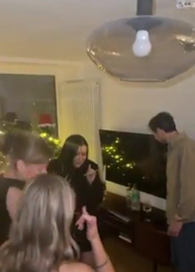 group of four women and one man in what appears to be a living room. The women are dressed in dark clothing, and the man is wearing a tan shirt and blue jeans. They are standing and talking. There is a Christmas tree visible through a window, and a lit television is on. A liquor bottle and a glass are on the table under the television. A large pendant light hangs from the ceiling. The room also contains a radiator and a bookshelf. The video appears to be shot indoors.