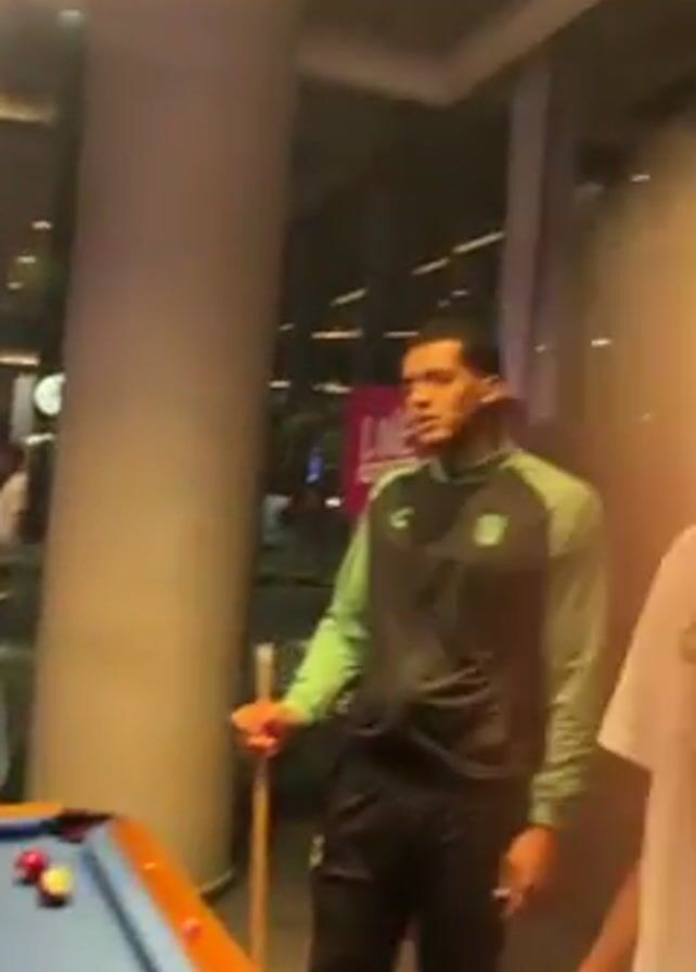 room with a pool table in the foreground. The camera pans up to reveal people milling about. A man wearing a green shirt and black vest is visible. There are tables covered with lime green cloths in the background. The room has large windows showing lights outside. The scene appears to be a party or social event.
