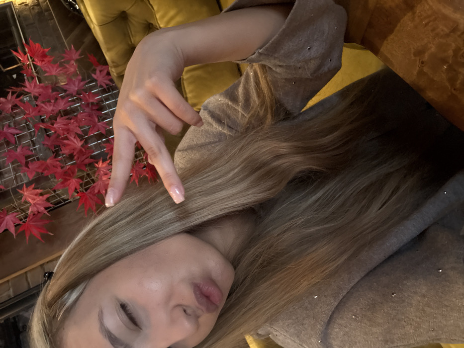 A female subject with long, light blonde hair is depicted indoors, positioned with her left eye closed and lips pursed. She is wearing a light beige long-sleeved top adorned with numerous small, reflective silver embellishments. Her right hand is raised, displaying a peace sign with extended index and middle fingers; her fingernails are coated with a light pink or nude polish. The background features a decorative wall element constructed from multiple red artificial maple leaves arranged on a dark grid. To the subject's right, a section of a mustard yellow, button-tufted sofa or booth seating is visible. A polished brown wooden surface, consistent with a table, occupies the lower right foreground. The environment suggests a commercial interior, such as a cafe or restaurant. The specific location within Plovdiv, Bulgaria, cannot be determined from the visual information provided.