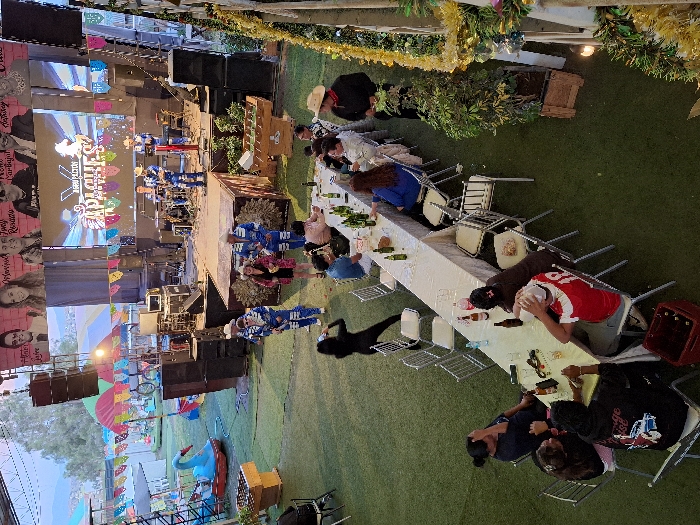 The scene is located at the coordinates -16.459, -71.545 in Socabaya, Peru. A long table with white tablecloth and about 15 white chairs is set up outdoors with a group of 10 people seated, some drinking from bottles and glasses, others talking and laughing. The table is centered in the image, while in the background, a band in dark blue uniforms plays on a stage with a large screen behind them. There are many speakers and other equipment for a live performance on the stage. There is an artificial green grass lawn under the table and stage. Around the edge of the frame are various decorations and potted plants. To the left is a large white swan-shaped inflatable toy and to the right are several Christmas lights and decorations. The stage is decorated with brightly colored streamers, and the screen behind the band is displaying a title for the performance.