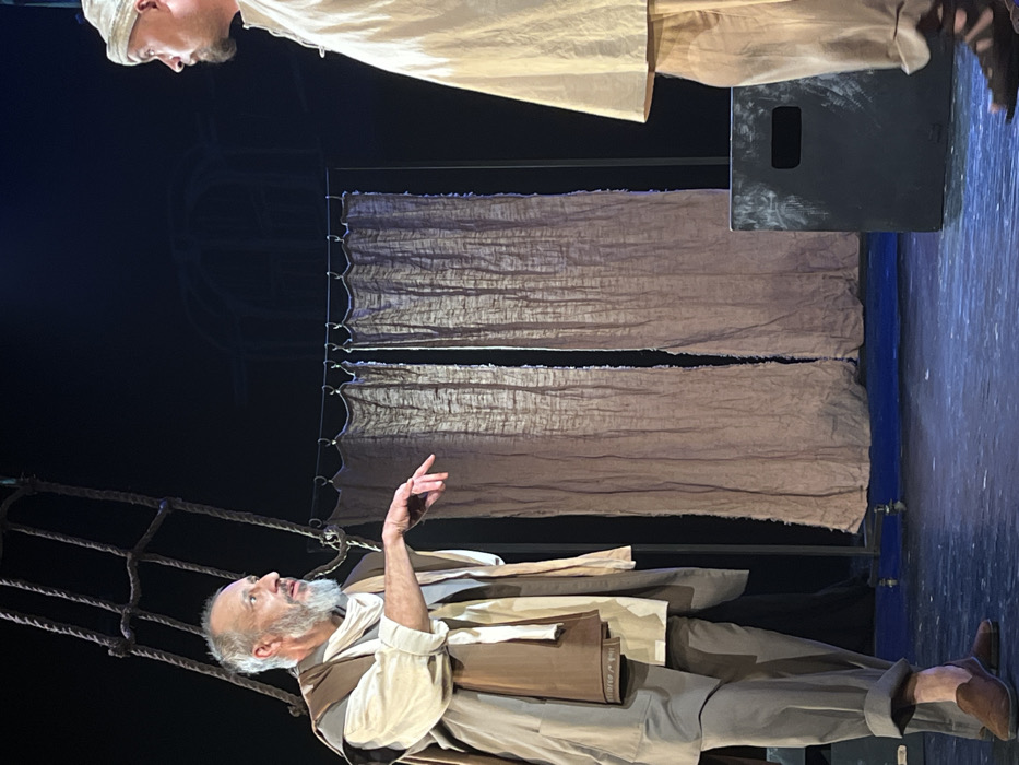 The image depicts a theatrical performance on a stage in Novoshakhtinsk, Russia. Two male actors are present. On the left, a middle-aged to elderly man with a grey beard and short grey hair wears a light-colored long-sleeved shirt, brown trousers, a brown tunic or vest, and a light-colored scarf. He is pointing his right index finger forward and slightly downwards, with his mouth slightly open, appearing to speak. He wears brown slip-on shoes. Facing him on the right, partially visible in profile from the waist up, is a younger man with a short beard, wearing a light-colored tunic and a matching head covering. He is looking towards the first man. The stage background is predominantly dark. In the center, two large, vertical panels of crumpled, light brown fabric hang from a horizontal bar. To the upper left, a portion of a rope ladder-like structure is visible. In the distant background, a faint, dark, skeletal architectural structure, possibly a dome or archway, can be discerned. On the stage floor to the right, a dark, rectangular stage prop with a cutout handle is positioned near the second actor's leg. The stage floor itself is dark with reflective areas.
