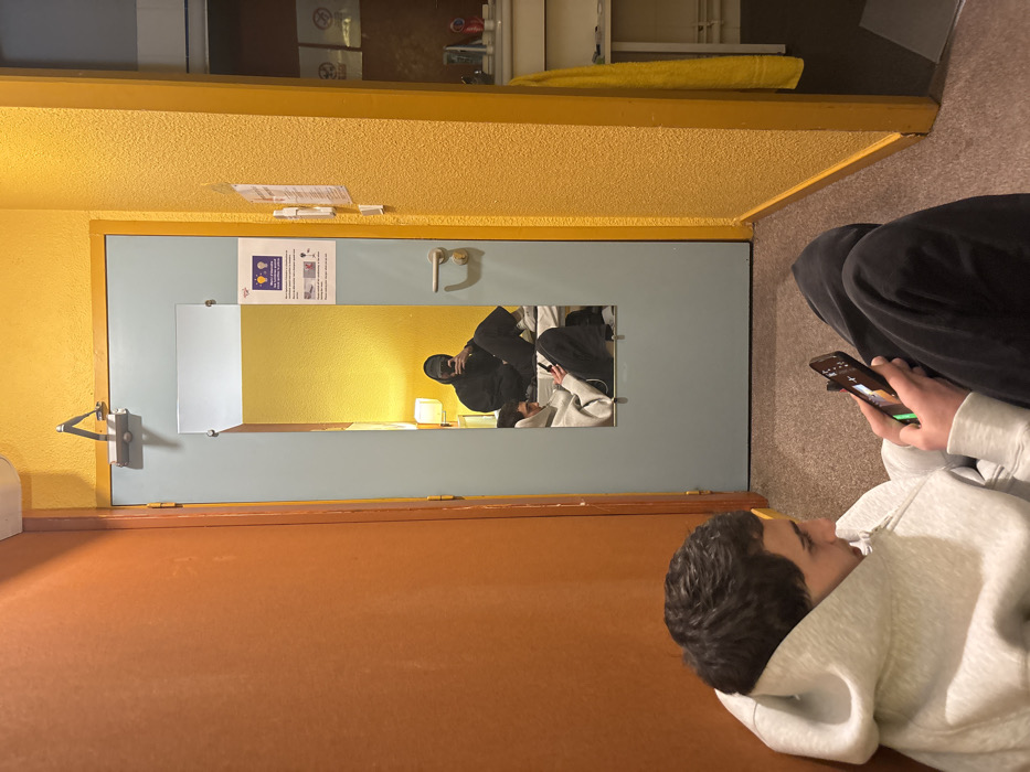 A person in a hoodie is looking at a phone. In the background, a door with a mirror reflects two individuals. One is wearing a black jacket and face covering and holding a phone. The other, in light-colored clothing, also holds a phone. The room has yellow and orange walls. The camera angle is sideways.