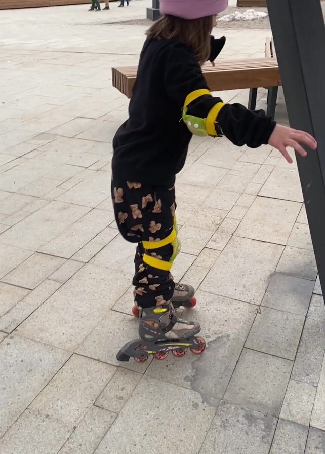 - "A young girl wearing inline skates, a pink hat, black sweat suit with bear patterns on the legs and yellow elbow and knee pads is holding onto a black metal column in a public square" by FM-J3rfY2, licensed under CC BY 4.0