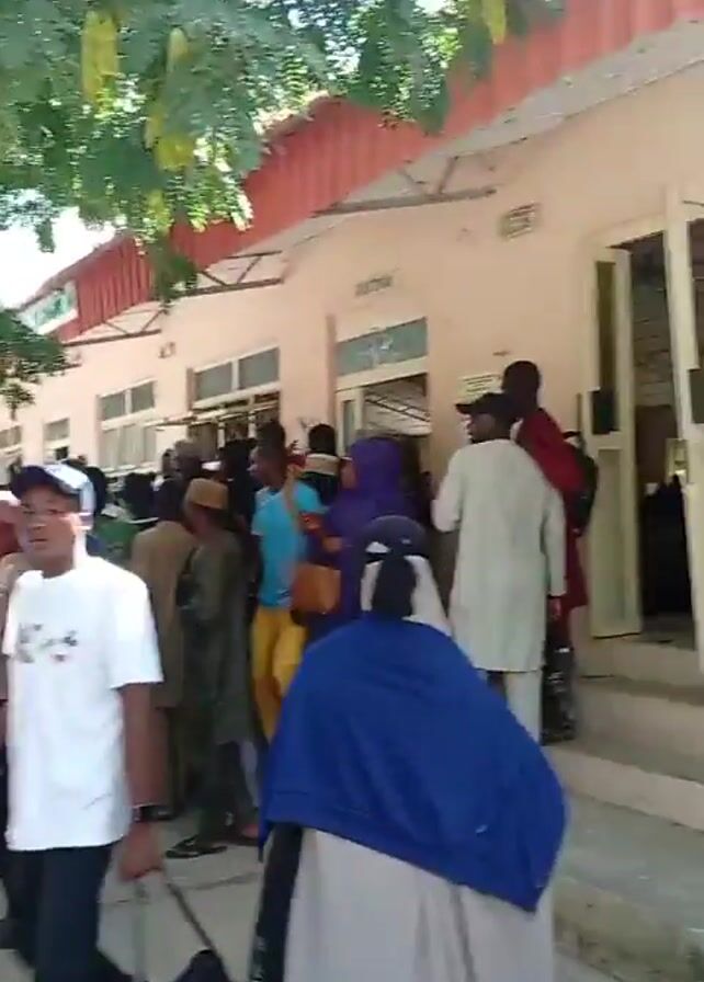 A crowd of people, seemingly patients and visitors, are gathered outside a building that appears to be a clinic or hospital