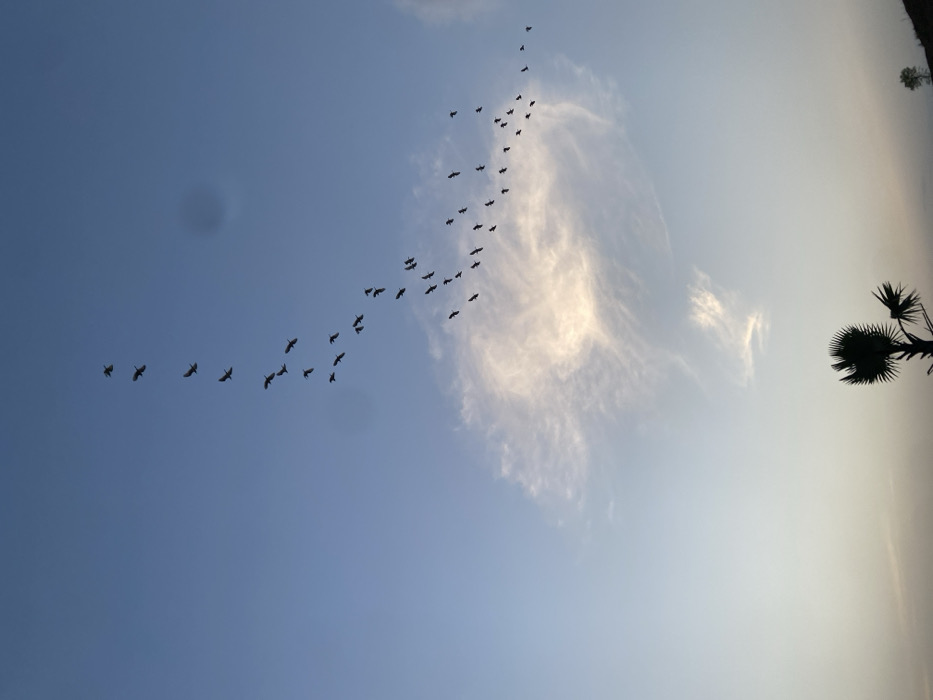A flock of birds flies in formation across a blue sky, their silhouettes stark against the bright, wispy clouds