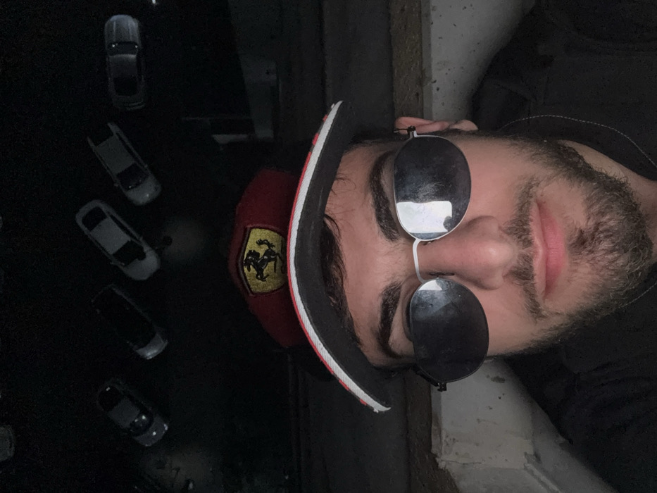 The image displays a male subject in a selfie perspective, captured from the mid-chest up against a dark background, in the city of Tbilisi, Georgia. The individual wears dark, aviator-style sunglasses with silver frames and a red baseball cap featuring a yellow Ferrari "Prancing Horse" logo on the front. He has dark hair, prominent eyebrows, and a trimmed beard/goatee, with a dark-colored garment visible on his torso. Above and behind the subject, a dimly lit urban environment is discernible from an elevated vantage point, showing at least five light-colored vehicles parked or in motion on a street or parking area below, illuminated by distant light sources. The scene appears to be set at night, with the subject positioned on an elevated structure overlooking the street level.