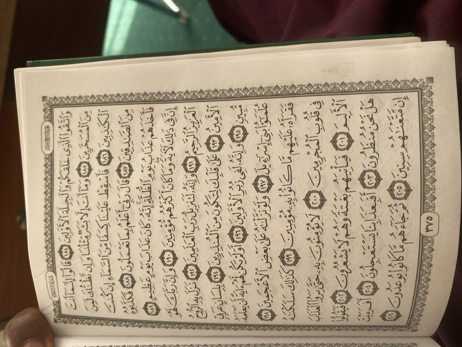 An open copy of the Quran is depicted, held by a person's left hand in the upper left quadrant. The hand displays a dark skin tone, with the thumb and a portion of the index finger visible, gripping the spine area. The book is open to page 375, indicated by the Arabic numerals "٣٧٥" at the bottom center. The page features classical Arabic script with diacritics, framed by a decorative border along the margins. Verses 184 through 205 of Surah Ash-Shu'ara (Chapter of The Poets) are visible, each verse number enclosed in an ornate hexagonal design. The book's right edge shows a sliver of its green binding. The background is blurred, revealing a dark reddish-purple fabric or surface on the right, and indistinct lighter areas further back, suggesting an indoor setting with ambient light. The scene occurs in the city of Katcha, Nigeria.