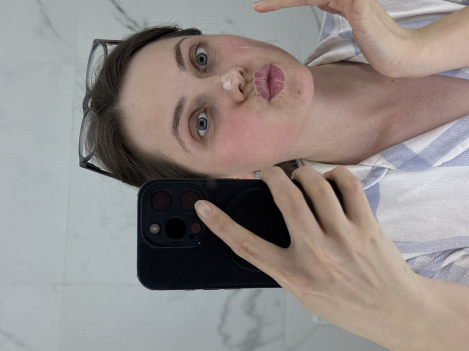 The image depicts a woman taking a mirror selfie in what appears to be a bathroom, located in the city of Scafati, Italy. The woman has fair skin, light brown hair, and dark-rimmed eyeglasses resting on her head. Her face shows areas of pinkish redness on the cheeks, and there is a visible white dollop of cream on the bridge of her nose and a faint streak of cream on her left cheek. She is making a "kissing" face with puckered lips. Her left hand holds a black smartphone, identifiable by its multi-lens camera array, positioned to capture her reflection. Her right hand is partially visible, with an index finger extended upwards, possibly in a gesture or as part of the pose. She is wearing a light-colored garment with thin blue and white vertical pinstripes. The background behind her consists of white or light grey rectangular tiles with subtle veining.