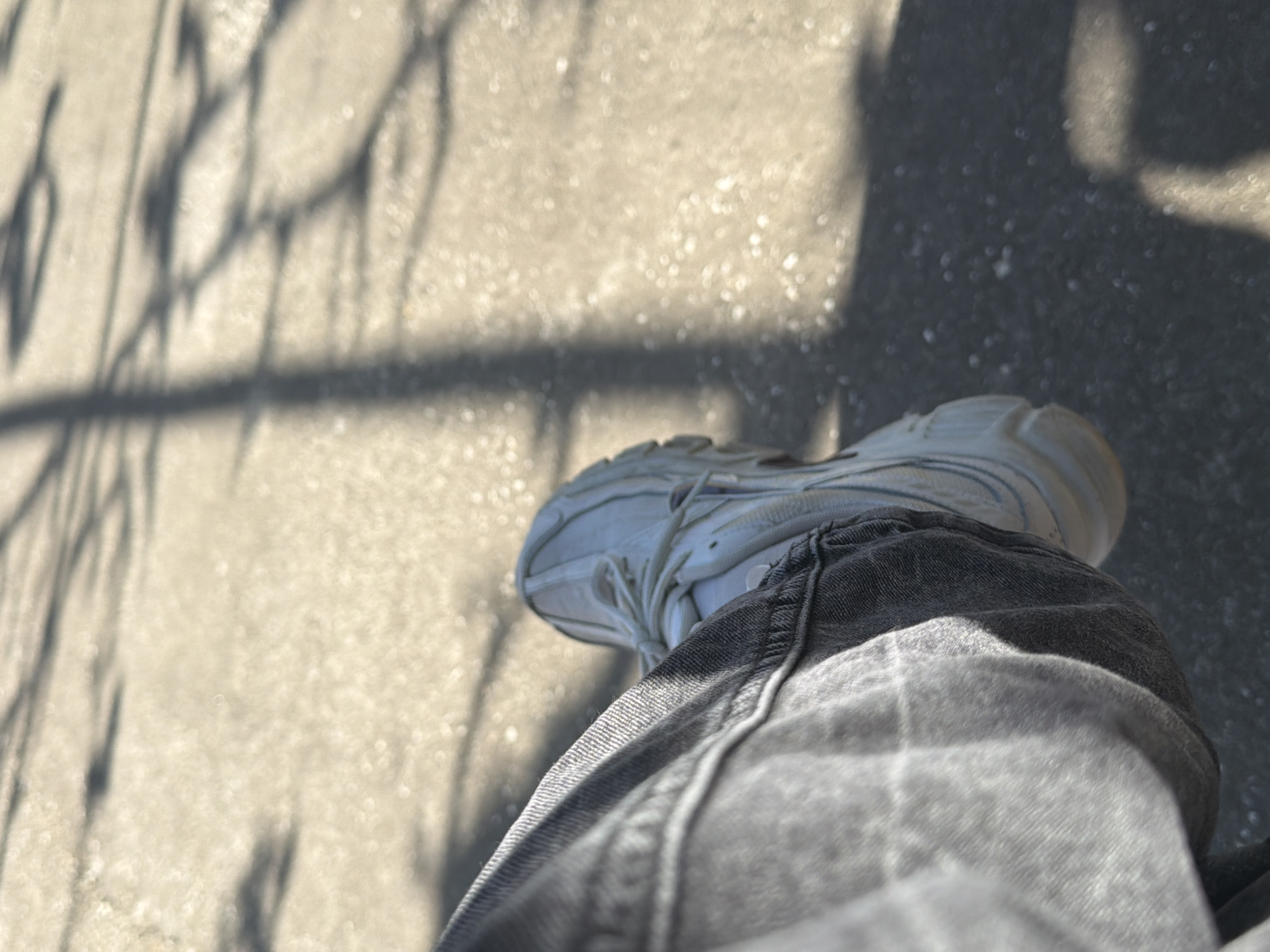 person's lower leg and foot, wearing a grey jean and a white sneaker. The person is standing on a light-colored surface, possibly concrete, with shadows cast across it, likely from nearby vegetation. The setting is potentially urban, given the paved surface, but the specific location in Trivoditsi, Bulgaria, is not evident from the image itself.