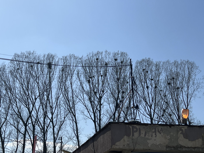 This image depicts a static outdoor scene in Busmantsi, Bulgaria, under a clear blue sky. The dominant feature is a linear arrangement of approximately eight bare deciduous trees, devoid of leaves, suggesting late winter or early spring. Numerous bird nests are visible among the branches of these trees. Across the upper portion of the image, overhead power or communication lines traverse horizontally. The lower right quarter of the frame shows the top section of a weathered, flat-roofed building, constructed of concrete or stucco, exhibiting peeling plaster and faint, faded Cyrillic lettering, possibly "ОРИ-" or "ОПИ-", on its facade. A vertical metal pole or antenna structure rises from the building's roof, extending into the tree line. An active amber or orange warning beacon is mounted on the right edge of the building's roof. No individuals or discernible actions are present.