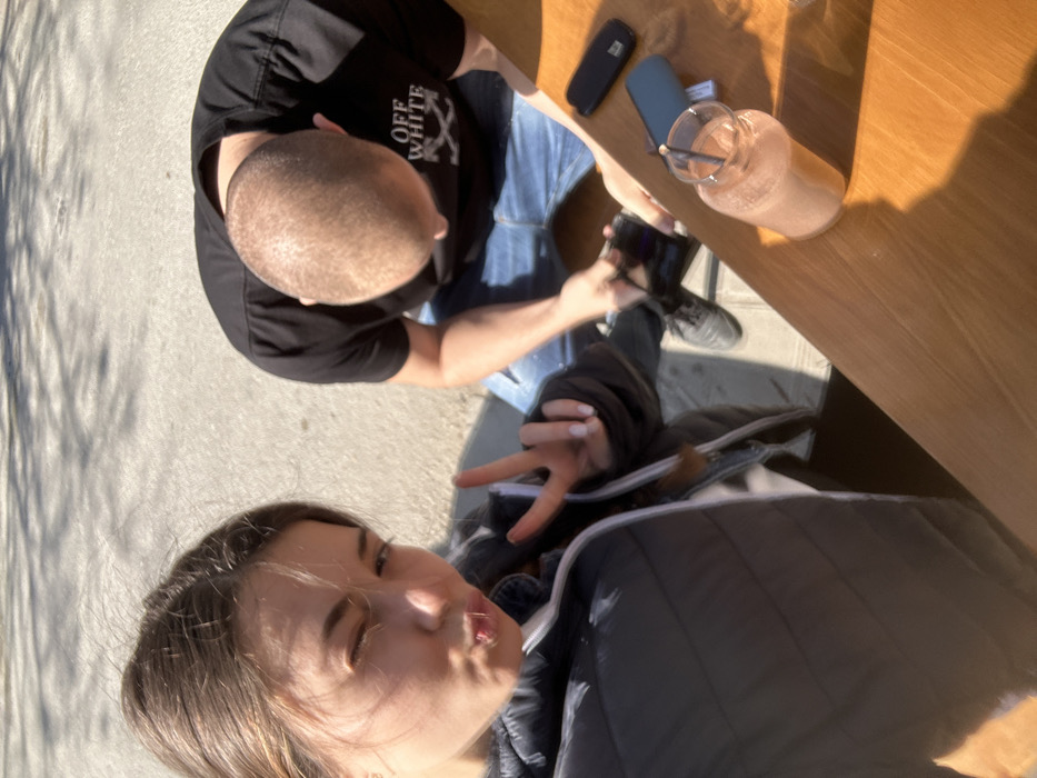 The image captures two individuals seated at an outdoor wooden table under direct sunlight in Veliko Tarnovo, Bulgaria