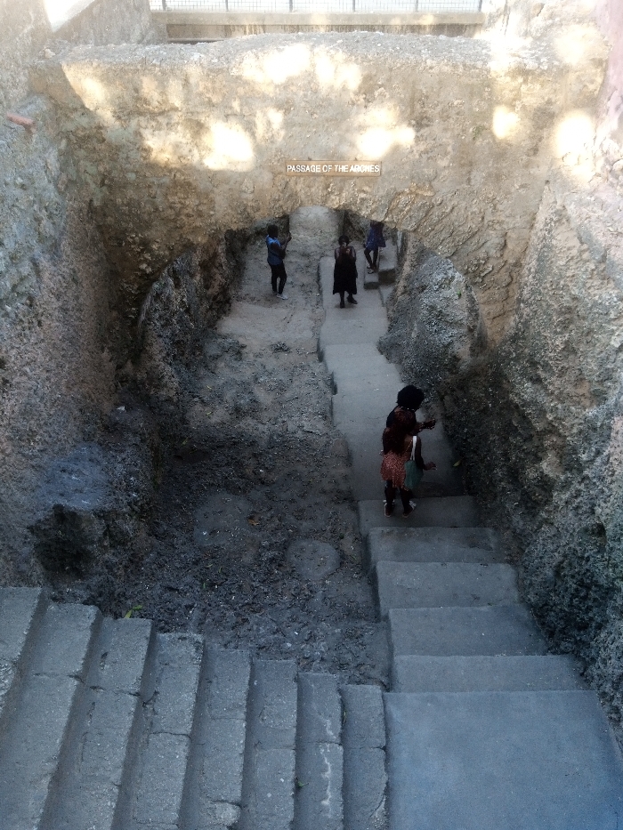 The image displays the "Passage of the Agonies" within Fort Jesus, located in the Makadara/Mji Wa Kale ward of Mombasa, Kenya