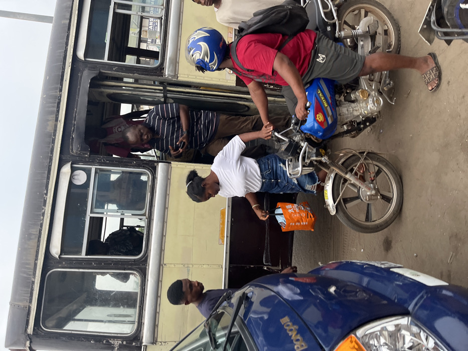 - "A woman in a white shirt and blue jeans stands between a bus and a motorcycle, handing something to the driver of the motorcycle who is wearing a red shirt and blue helmet" by FM-Nlg7v2, licensed under CC BY 4.0