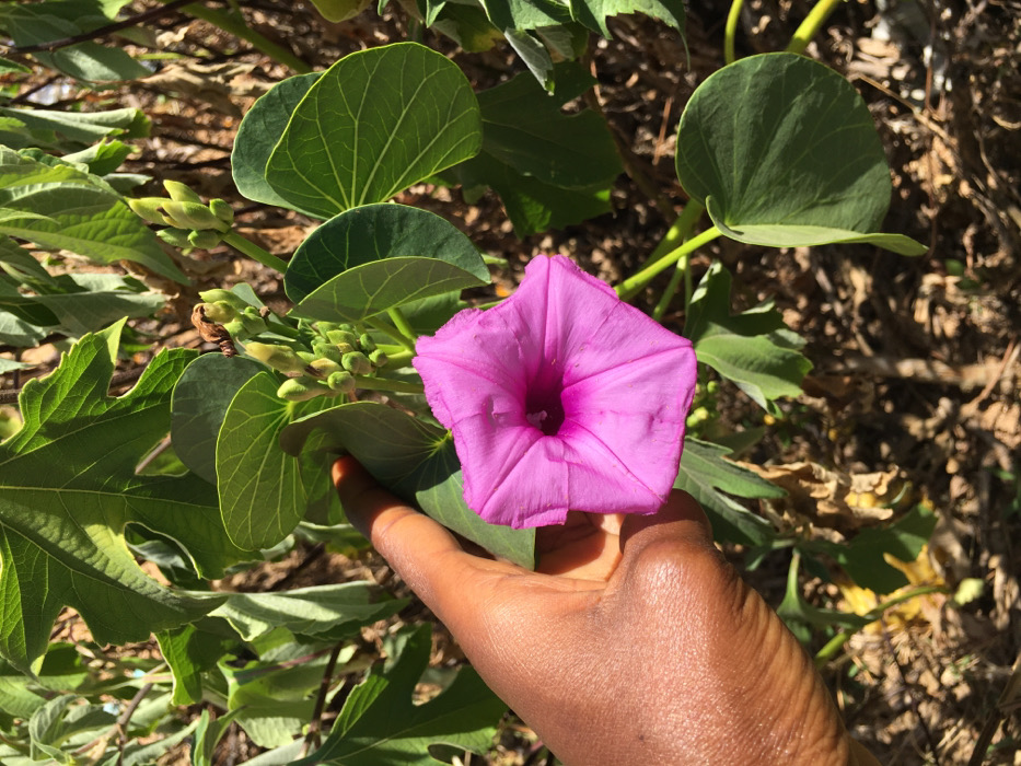 A close-up photograph displays a dark-skinned human hand holding the stem of a vibrant pink or magenta funnel-shaped flower with a darker center, appearing to have five distinct petal lobes. The hand is positioned from the wrist upwards, with the thumb near the stem and the index finger curled around it. Surrounding the prominent flower are numerous green leaves of varying shapes, including some rounded leaves directly associated with the flower and more lobed leaves further in the background. Several small, green, unopened flower buds are also visible on the plant stems. The background consists of dense green foliage and some dried brown leaves or ground cover, illuminated by bright natural sunlight. The image does not contain any visual information to specifically identify a location within the city of Jos, Nigeria.