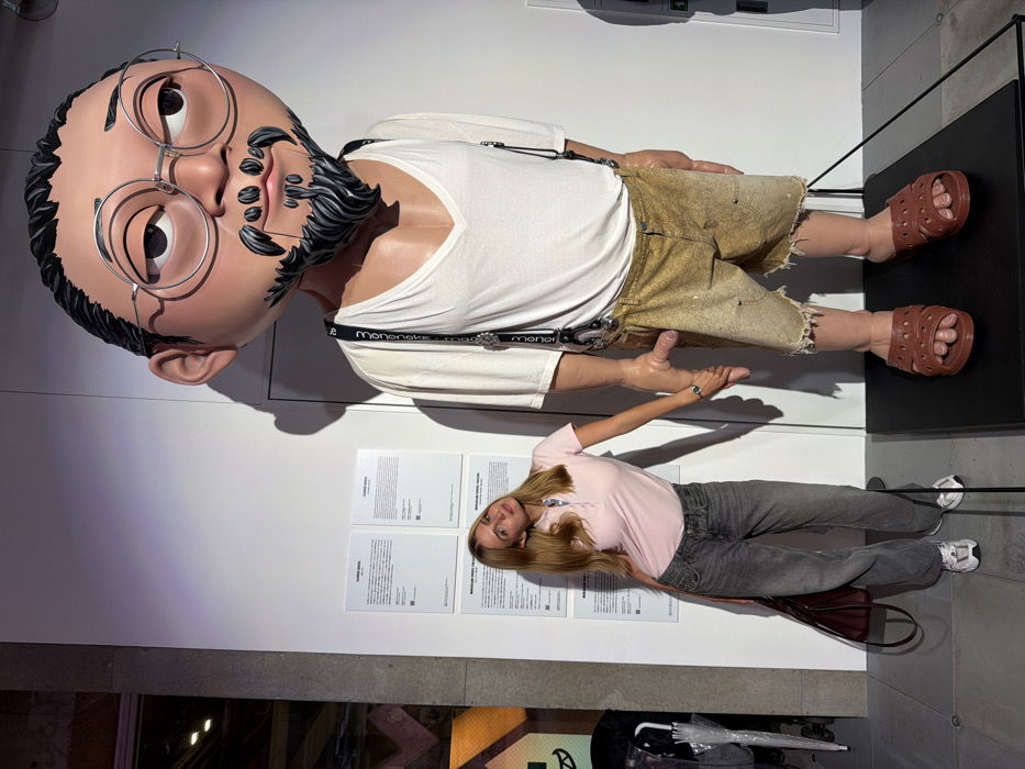 A woman poses next to a large, stylized, anthropomorphic sculpture of a male figure in an art gallery in Chuo, Japan