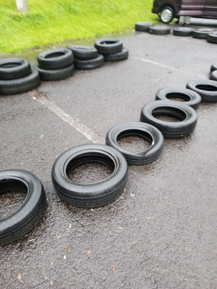 Black tires are arranged in a semi-circular pattern on a wet, asphalt surface. Some tires are stacked in small piles, while others are placed individually. The tires appear to be used or recycled. In the background, a grassy area and a dark-colored van are visible. The overall setting is outdoors, likely a parking lot or similar paved area.
