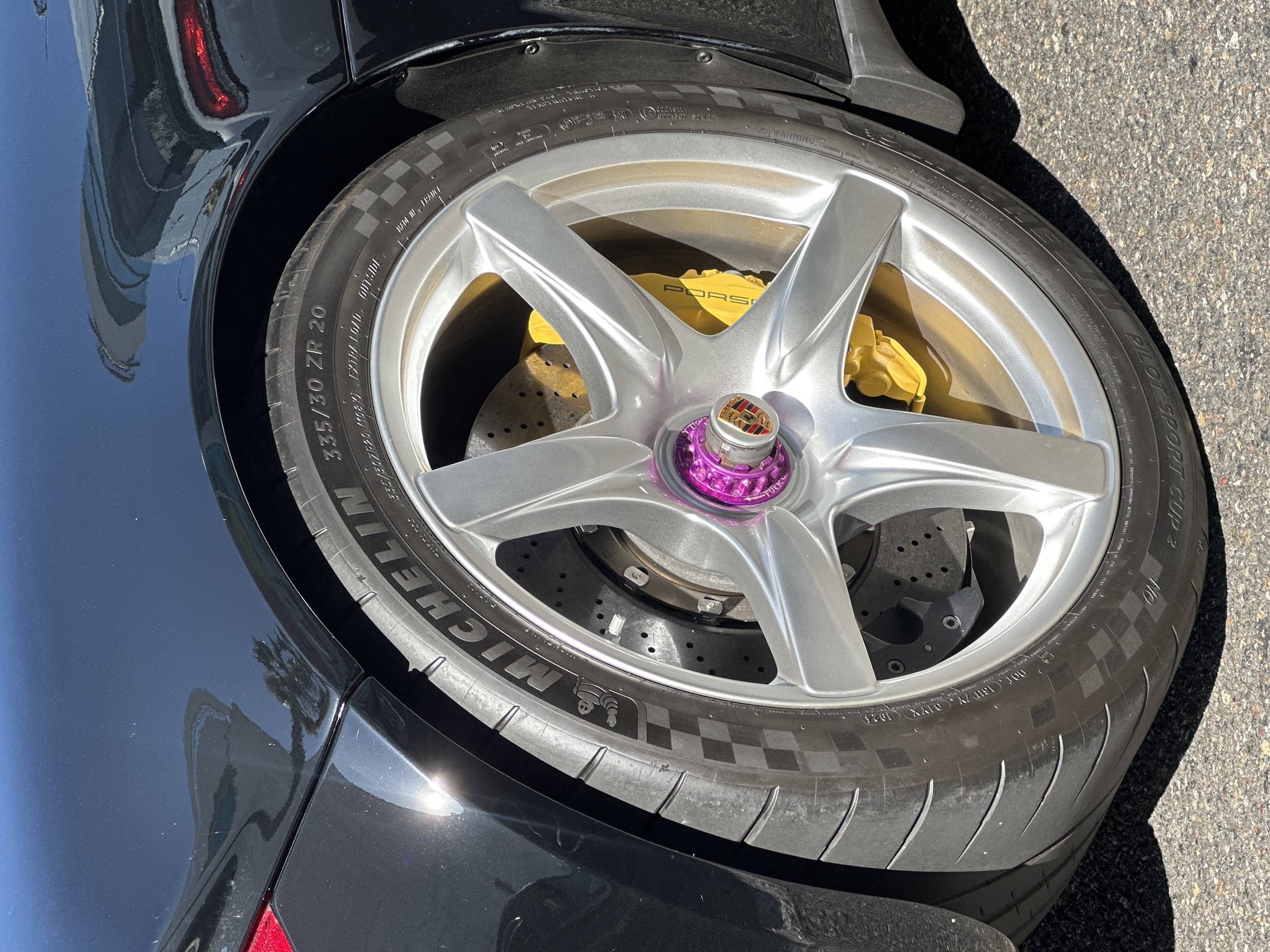 A close-up shot showcases the rear wheel of a black Porsche. The wheel features a unique five-spoke silver design with a purple center locking mechanism, complete with the Porsche crest. The yellow brake caliper with the Porsche logo is visible behind the wheel. The tire is a Michelin Pilot Sport Cup 2, size 335/30ZR 20. Details like "MADE IN FRANCE" and various tire specifications are also captured. A portion of the asphalt ground is visible.