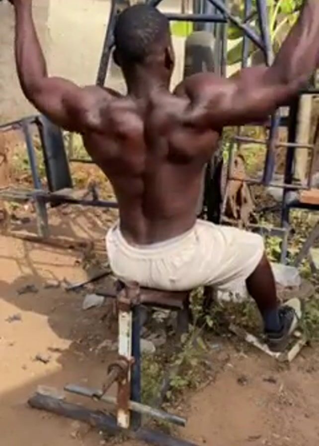 A shirtless black man does a behind-the-neck lat pulldown workout outside in front of a partially visible one-story tan building. The man is seated on a blue and white metal seat and wearing light-colored shorts and black sneakers. He has a muscular physique, and his back muscles are tensed as he pulls the weighted bar behind his neck. The weight machine appears to be handmade and worn. The ground around the weight machine is dirt with patches of grass. Behind the building, a few green plants can be seen.