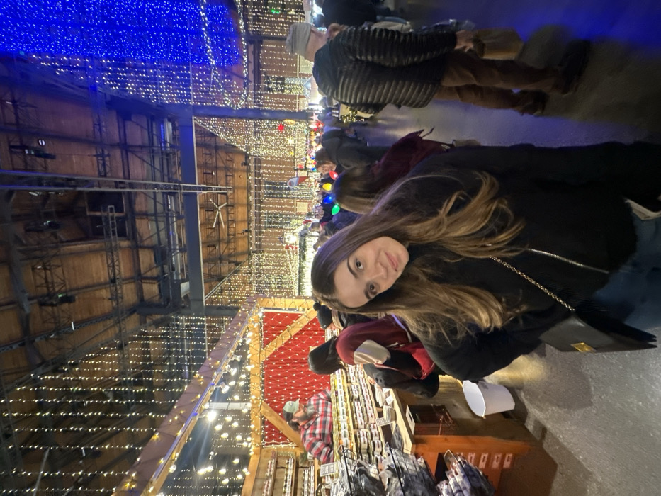 A young woman smiles at the camera indoors, surrounded by people. She wears a black jacket and a purse hangs from her shoulder. Strings of lights adorn the ceiling, creating a festive atmosphere. Below, vendor displays showcase goods for sale. The building has visible metal beams and a high ceiling.