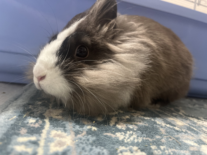 - "A fluffy rabbit sits on a blue patterned rug" by FM-PwRFu2, licensed under CC BY 4.0