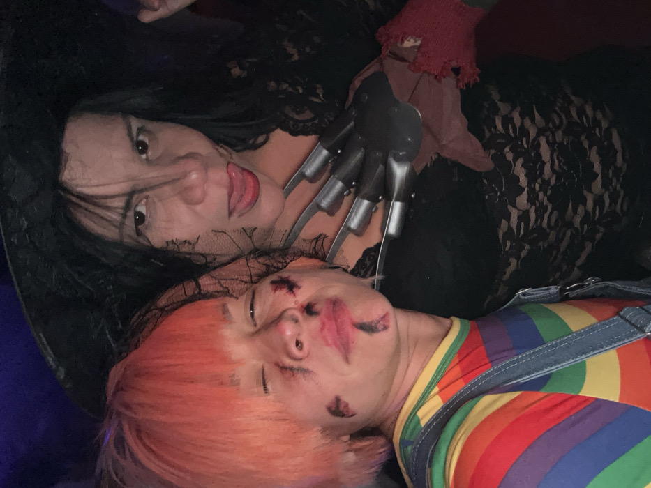 The image displays two individuals in costumes, posing closely together, likely at an indoor event in Dresden, Germany. The person on the left has short, bright orange hair with bangs and facial makeup simulating dark smears or wounds on the cheeks and chin. This individual wears a rainbow-striped long-sleeved shirt underneath blue denim overalls, resembling a Chucky costume. Their left eye is partially closed, and the mouth is closed in a slight pout. The person on the right, appearing female, has long dark hair, partially covered by a wide-brimmed black hat adorned with dark lace. Their face is made up with dark smudges and lines, featuring red lipstick. Their tongue is partially extended, and their eyes are directed towards the viewer. They wear a black lace top. On their right hand, they display a metal glove with blades, consistent with a Freddy Krueger costume accessory, complete with a tattered red fabric cuff at the wrist. The background is dark and indistinct, showing subtle hints of purple and red illumination, characteristic of an event setting.