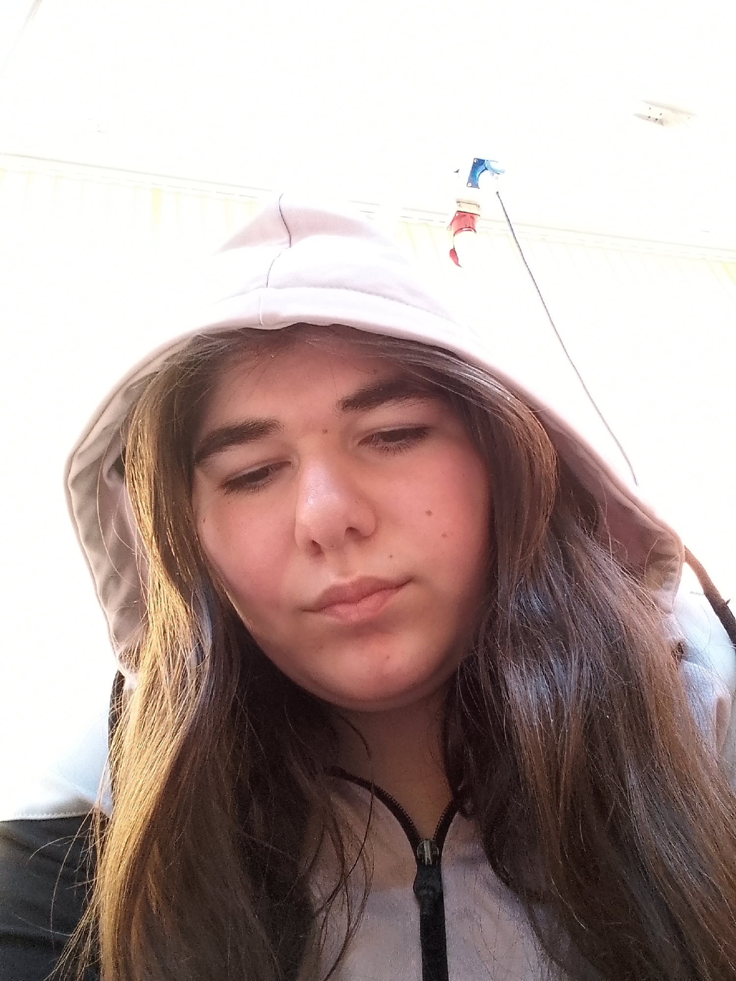 The image depicts an indoor scene in Popovo, Bulgaria, centered on a young female individual. She is seen from an upward-angled, close-up perspective, looking downwards and slightly to the viewer's right with a neutral expression and subtly pursed lips. Her long, dark brown hair cascades around her face and shoulders. She is wearing a light-colored hooded top, with the hood covering her head; a black zipper is visible, partially open, at the garment's front. The background consists of a brightly illuminated white ceiling. A light-colored horizontal strip is present along the upper edge of the background. Mounted on the ceiling are a white rectangular object, possibly a sensor or alarm, and to its left, a multi-colored electrical connector (featuring blue, red, and white components) from which a dark cable extends downward.