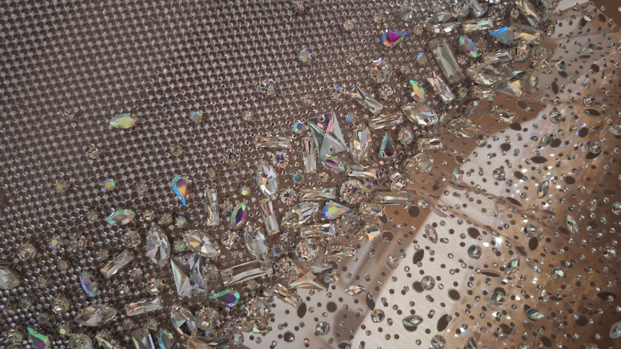 close-up of fabric with various sizes and shapes of crystals and beads attached