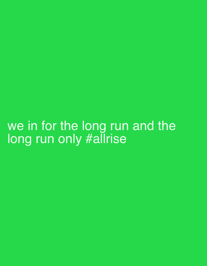 - "A vibrant green background displays the text "we in for the long run and the long run only #allrise" in white, centered vertically and towards the lower half of the frame" by FM-13LyK2, licensed under CC BY 4.0