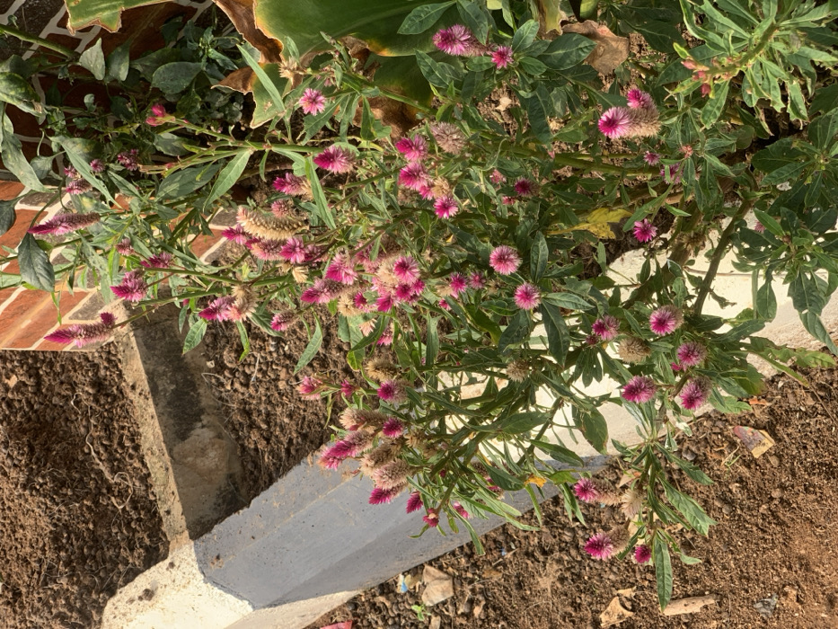 The image displays an outdoor scene in Ikorodu, Nigeria, focusing on a dense cluster of flowering plants. The primary subjects are numerous Celosia plants, characterized by vibrant fuchsia-pink and lighter beige-brown conical and globular inflorescences. These plants exhibit green foliage, some leaves showing minor discoloration. To the left, a light grey concrete border or planter edge is visible, forming a sharp corner. This concrete structure separates the flowering plants from an area of dark brown, loose soil, which contains small pieces of organic debris. In the upper right background, a section of a reddish-brown brick wall is partially obscured by the plants. The scene is illuminated by natural daylight. No people or animals are present, and no actions or interactions are depicted.