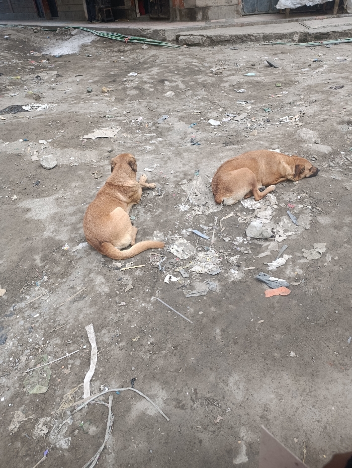 Two light-brown dogs rest on a dirt and debris-strewn surface. One dog lies stretched out, head down. The other sits with its back to the viewer, tail slightly curled. The ground is covered with bits of trash, including small pieces of paper, plastic, and thin sticks. A building facade and some green pipes are visible in the background. The scene is somewhat drab and unkempt.