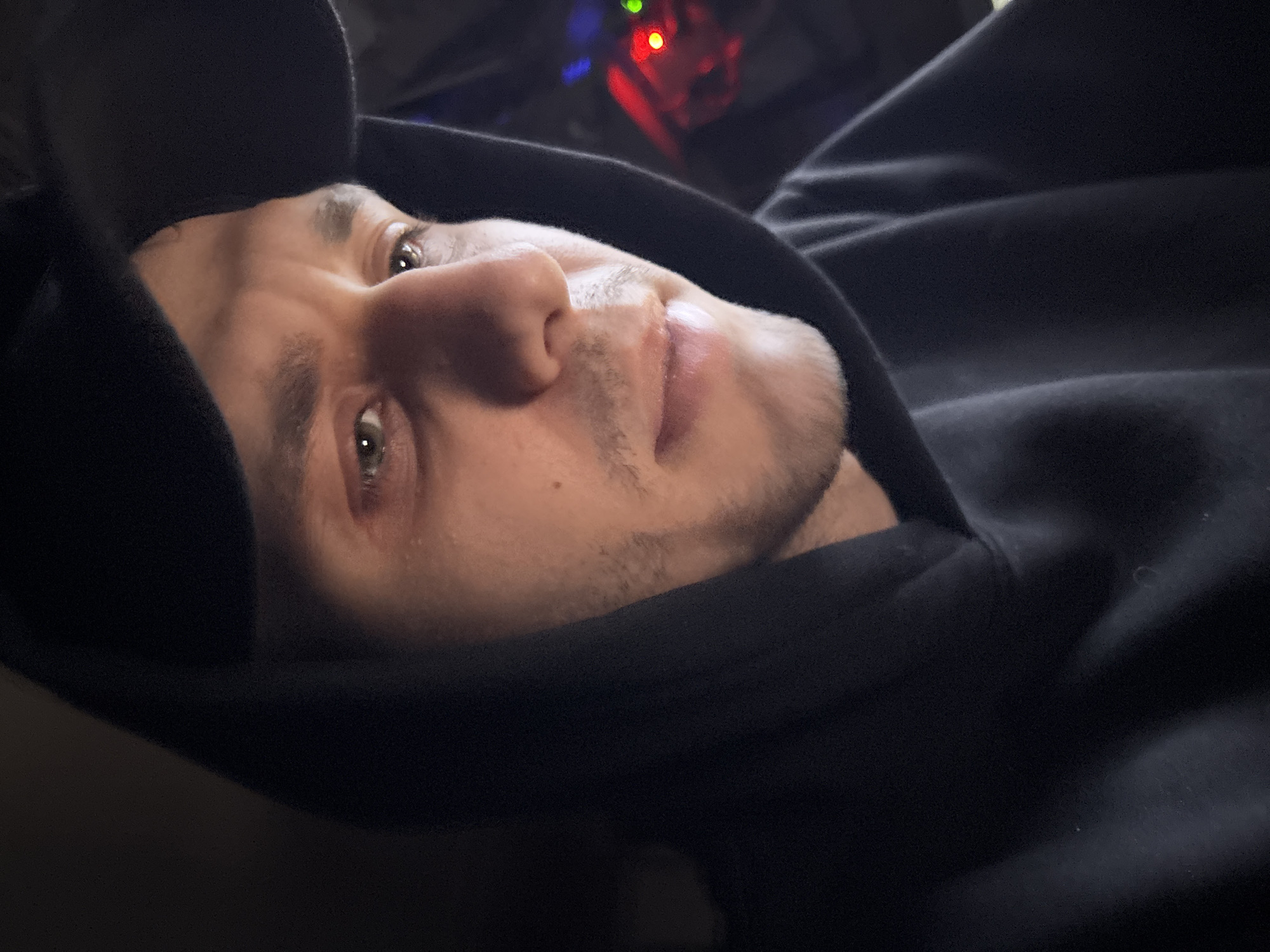 A close-up, angled portrait features a light-skinned male wearing a black hooded sweatshirt. The hood is up, partially obscuring the subject's forehead. He has short, dark hair and stubble. His eyes are light-colored and appear to be gazing slightly upward. The background is dark and blurry, with hints of red and green lights. The photo was taken indoors. There is no indication this photo was taken in Saratov, Russia.