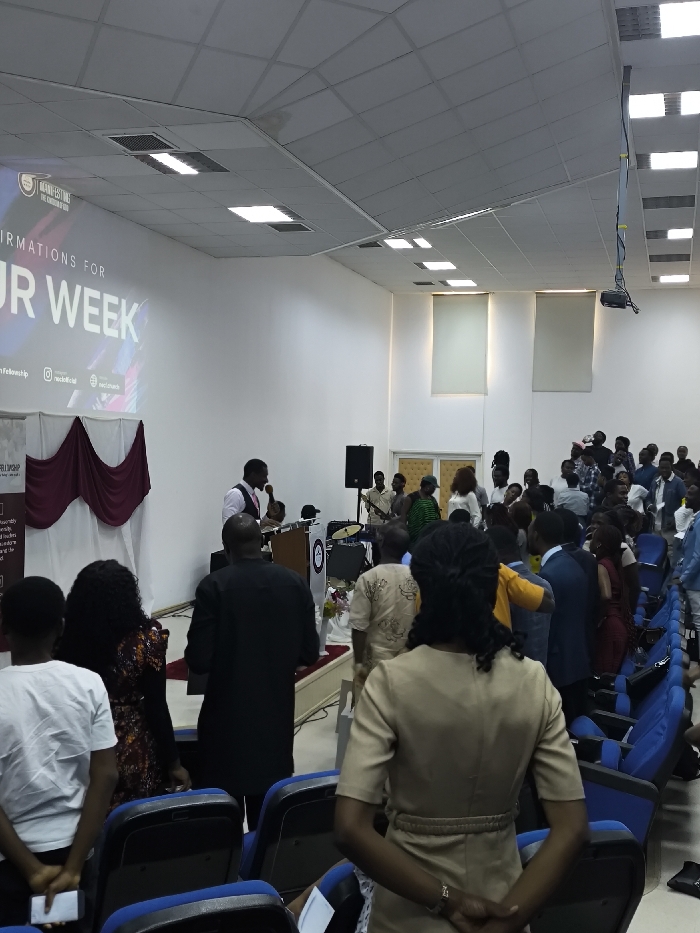 This image depicts an indoor gathering in Kızılbaş, Northern Cyprus / Cyprus. The scene shows a spacious room with white walls and a white drop-tile ceiling fitted with numerous square fluorescent light fixtures. On the left, a large projection screen displays text including "AFFIRMATIONS FOR OUR WEEK" and "MANIFESTING THE KINGDOM OF GOD," along with social media handles such as "@rnecfellowship" and "@rnec.church." Below the screen, a stage area is visible with a white backdrop draped with burgundy fabric. At the front of the stage, a male speaker in a white shirt and burgundy vest stands behind a podium, holding a microphone and addressing an audience. To his right, a large black speaker is positioned. Further right and behind the speaker, several individuals are visible, including musicians with drums and other instruments, suggesting a live band. A white stand adorned with flowers is also present on the stage. A crowd of people, predominantly adults, fills the room, most standing and facing the stage. The individuals are dressed in varied attire, ranging from casual to semi-formal. In the foreground, viewed from behind, are several audience members: a person in a white t-shirt holding a small white object, a person with dark curly hair and a patterned dress, a man in a black tunic, and a woman in a tan dress with braided hair. Rows of empty and occupied blue upholstered seats with black frames are visible in the foreground and extending into the middle ground. On the right wall, two large rectangular windows covered by light-colored roller blinds are present. A projector is mounted from the ceiling on the right side of the room.