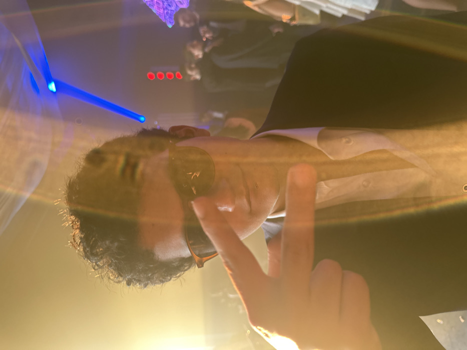 The image depicts an indoor event scene in the city of Huizúcar, El Salvador. In the foreground, a male individual with curly dark hair is centrally positioned, looking towards the camera. He wears brown-framed sunglasses, a white collared shirt with the top buttons open, and a dark suit jacket. A small, dark stud is visible on his lower lip. His left hand is raised directly in front of him, with the index and pinky fingers extended and the middle and ring fingers bent, forming a gesture. The scene is affected by a prominent warm-toned lens flare originating from the left, casting a glow across the subject and the left side of the frame. The background is dark and out of focus, populated by several indistinct figures, some appearing to be in formal or semi-formal attire, suggesting a social gathering. A distinct blue light beam projects diagonally downwards from the upper right, and a vertical series of four red circular lights is visible in the mid-right background. To the far right, a multicolored, possibly geometric, light fixture is partially visible.