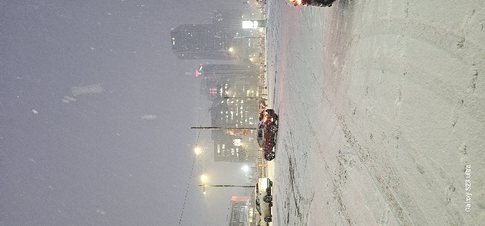 A street view during a heavy snowfall. High-rise buildings form a backdrop with illuminated windows. Cars line the snow-covered road, their tail lights visible through the falling snow. Streetlights cast a warm glow, adding to the wintery atmosphere. The scene is captured with a slightly off-center perspective, emphasizing the depth of the urban landscape in the midst of a snowstorm.