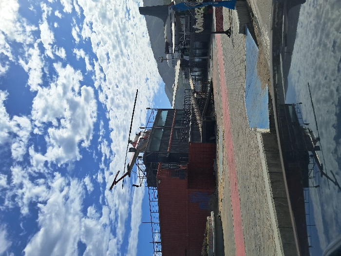 This image depicts an outdoor urban or commercial area located in Macuto, Venezuela, under a bright blue sky populated with scattered white cumulus clouds. The scene is observed from a low vantage point, with the dark, reflective surface of a vehicle's hood or dashboard occupying the bottom foreground, showing reflections of the sky and structures. The ground level features a paved area constructed from light-colored pavers or concrete, bisected by a prominent red strip. A low, gray curb separates this paved surface from the reflective foreground. To the right, a blue ramp-like structure is partially covered with light-colored sand. In the midground, a multi-tiered structure dominates the left, primarily composed of stacked, reddish-brown shipping containers, some exhibiting patches of blue paint or graffiti. Above these containers, a darker, multi-story building with large windows is visible. A red and white helicopter, appearing to be a static display, is mounted atop this building, with its main rotor blades extended and its tail boom and rotor visible. Further to the right, another complex of buildings, featuring dark materials, industrial aesthetics, and access ramps or stairs, is partially visible. A dark pole with a blue banner displaying fragmented text, "Vewsz," stands near these structures. The background presents vegetated mountains rising under the clear sky, partially obscured by the structures on the right. No individuals or active interactions are discernible within the frame.