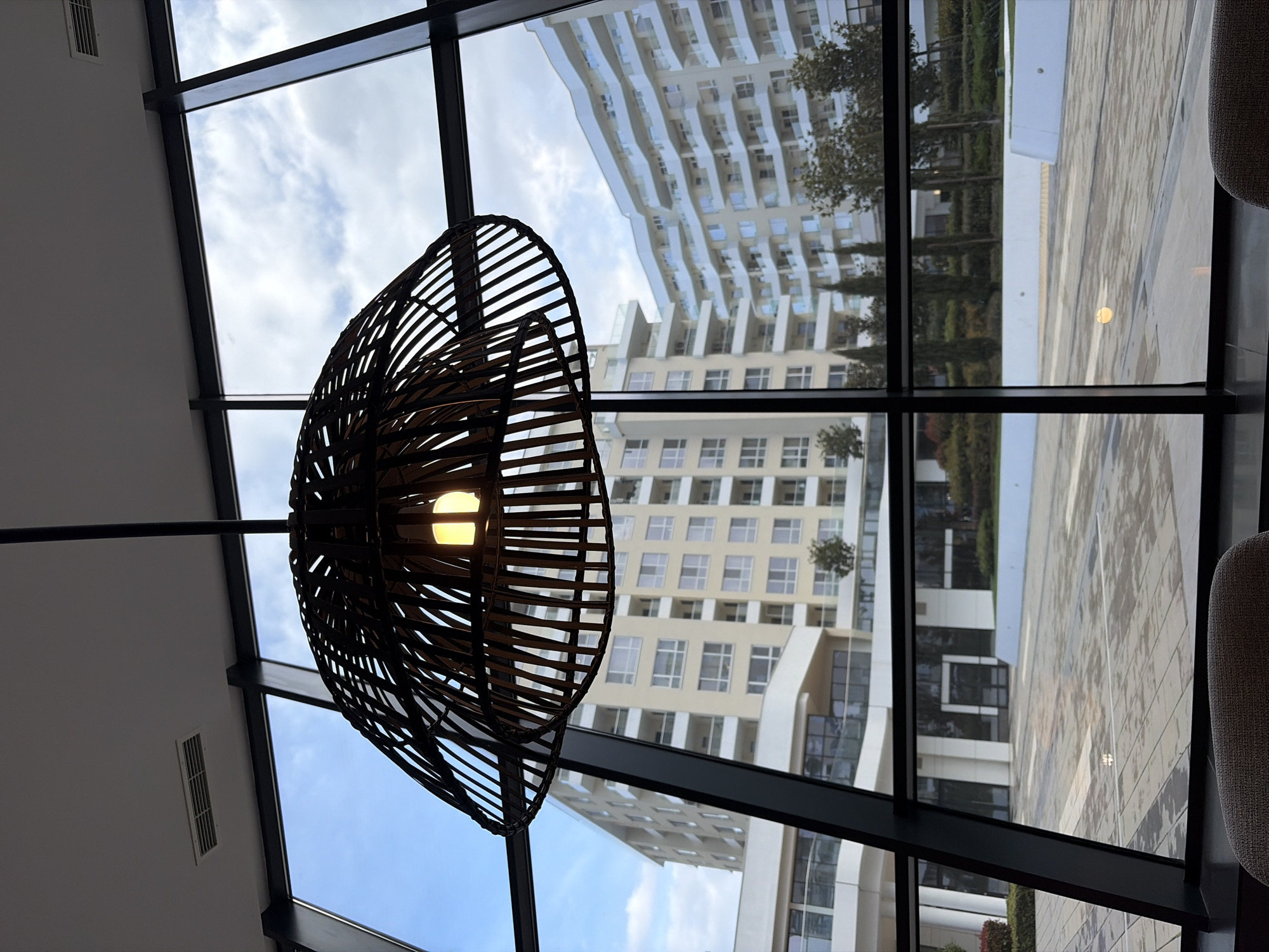 The image captures an interior view looking out through a large, multi-paned window with dark, angular frames