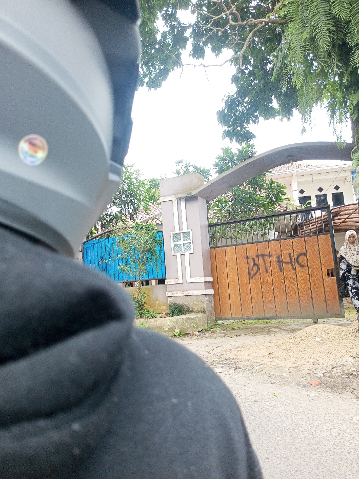 The image captures a residential street scene in Cibodas, Indonesia, from an over-the-shoulder perspective. The immediate foreground features the upper left side of a gray helmet with a small iridescent circular sticker, along with the shoulder and upper back of an individual wearing a dark, possibly black, hoodie or jacket. The midground reveals a narrow paved road, which appears to be dark asphalt or concrete, with scattered light-colored debris or gravel on its surface. A prominent house entrance structure is centered, comprising two light brown concrete pillars with white vertical decorative lines, supporting a curved archway above. The left pillar incorporates a square white glass block window. The main entrance features a brown wooden gate composed of vertical planks, topped with black metal bars. Black graffiti, spelling "BT HC," is marked across the wooden planks of the gate. To the left of the gate structure, a segment of a blue corrugated metal fence or wall is visible, behind which green foliage grows. Directly behind the gate and slightly to the right, a light-colored house with a tiled roof and dark-framed windows is partially observed. On the far right, partially obscured by foliage and the gate, a woman is seen. She wears a light-colored, patterned hijab and a dark, patterned long-sleeved garment with matching pants, appearing to walk or stand near the gate. The background consists of abundant green tree canopies and foliage beneath a bright, possibly overcast, sky.