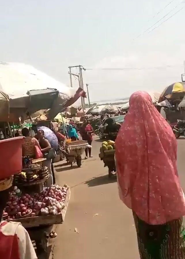 bustling marketplace, likely in a sunny region. A child in a red and white shirt carries a large red plastic tub on their head. The camera follows a woman in a pink floral headscarf and patterned skirt walking through the crowded market. Various stalls are visible under awnings, displaying produce such as tomatoes, onions, and other goods. People are walking around, some pushing carts loaded with items. A motorcycle is parked nearby, adding to the atmosphere of a busy public space. Power lines stretch across the sky above.