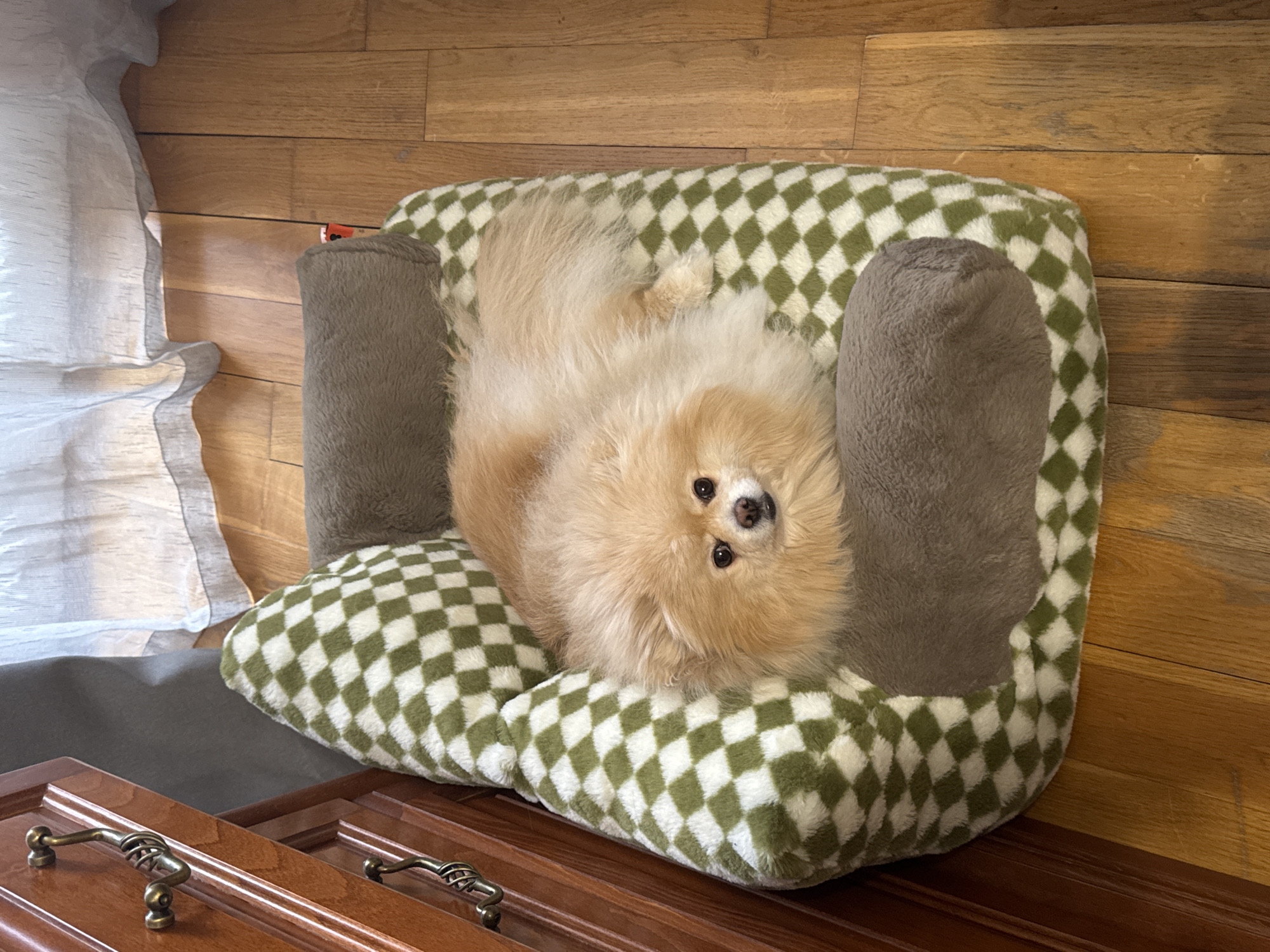- "A Pomeranian dog rests in a dog bed with green and white checkered fabric and gray side pillows" by FM-rJ28s2, licensed under CC BY 4.0